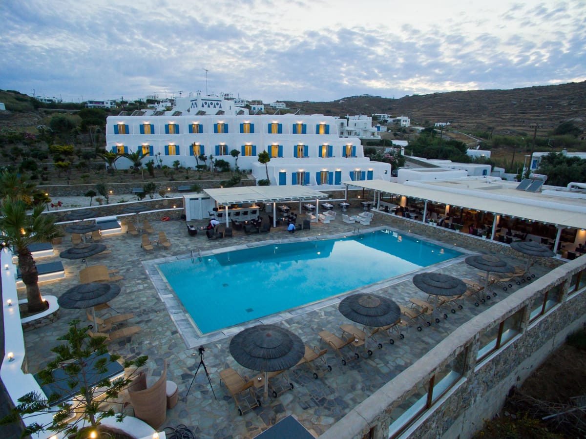 Painted in the traditional Greek colors of blue and white, nestling on a hill overlooking the bay of Ornos, Hotel Yiannaki is the perfect setting for your time in Mykonos island.