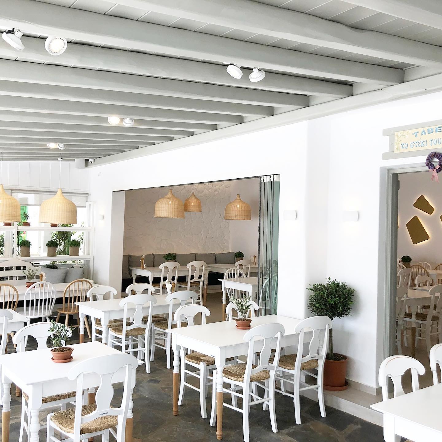 Η νησιώτικη αύρα είναι διάχυτη στο χώρο, ενώ η ολάνθιστη αυλή του με χάζι στην κεντρική πλατεία του «χωριού» προσφέρει ένα χαλαρό και δροσερό «καταφύγιο» για να γευτείτε σπιτικά μαγειρευτά και λαδερά από ντόπιες πρώτες ύλες, φρέσκες σαλάτες με μυκονιάτικα προιόντα και καλοψημένα κρέατα από τη φάρμα της οικογένειας (φημίζεται για τα παιδάκια του αλλά και για το «μπιφτέκι του Προέδρου»)!